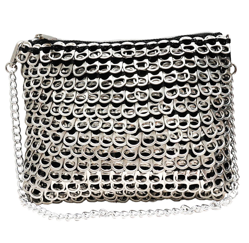 Handmade stylish handbag for any occasion. hand crafted with 100% upcycled ring pulls, zip opening and chain shoulder strap.