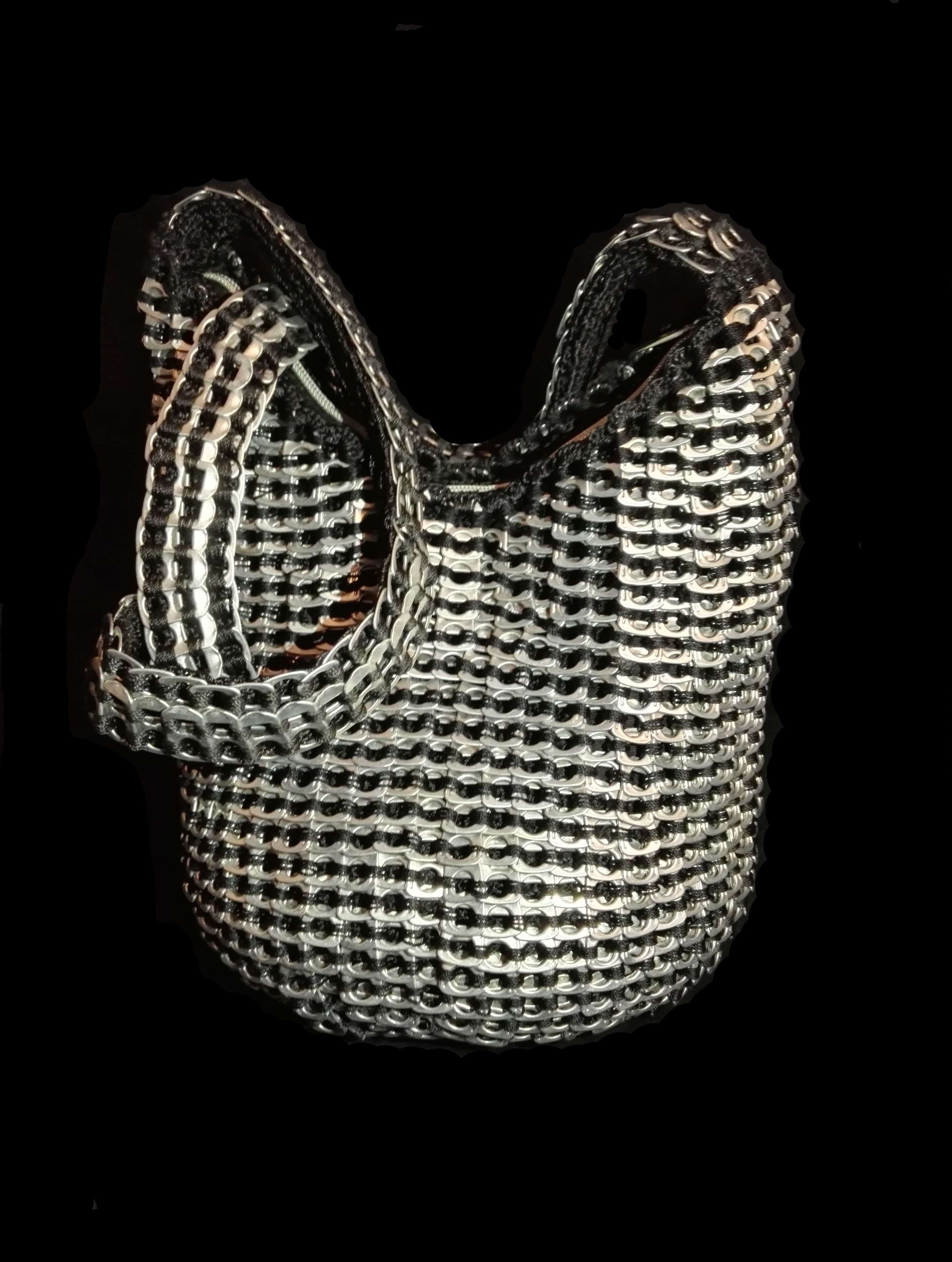 This fashionable everyday bag is made from upcycled ring pulls and has a ring pull shoulder strap. Fully lined with intergral zipped pocket.